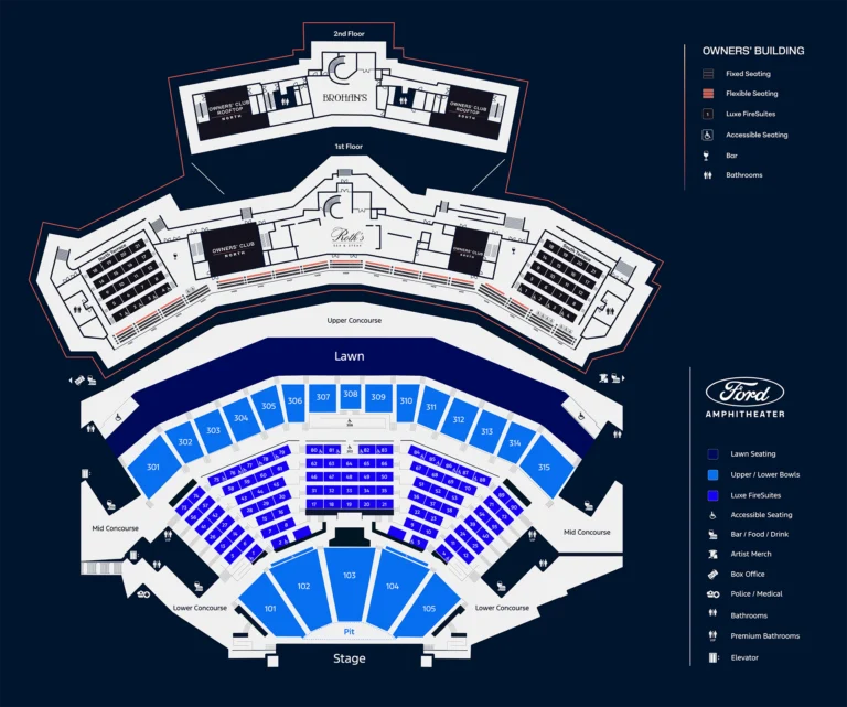 Accessible seating is available in many places within Ford Amphitheater, including the front and back sections for the fire pit suites, sections 102 and 104, 307 through 309 and the lawn. Ticket limits set by the promoter/performer for each show will be applied to accessible seating areas as well. Please check the seating chart for details.