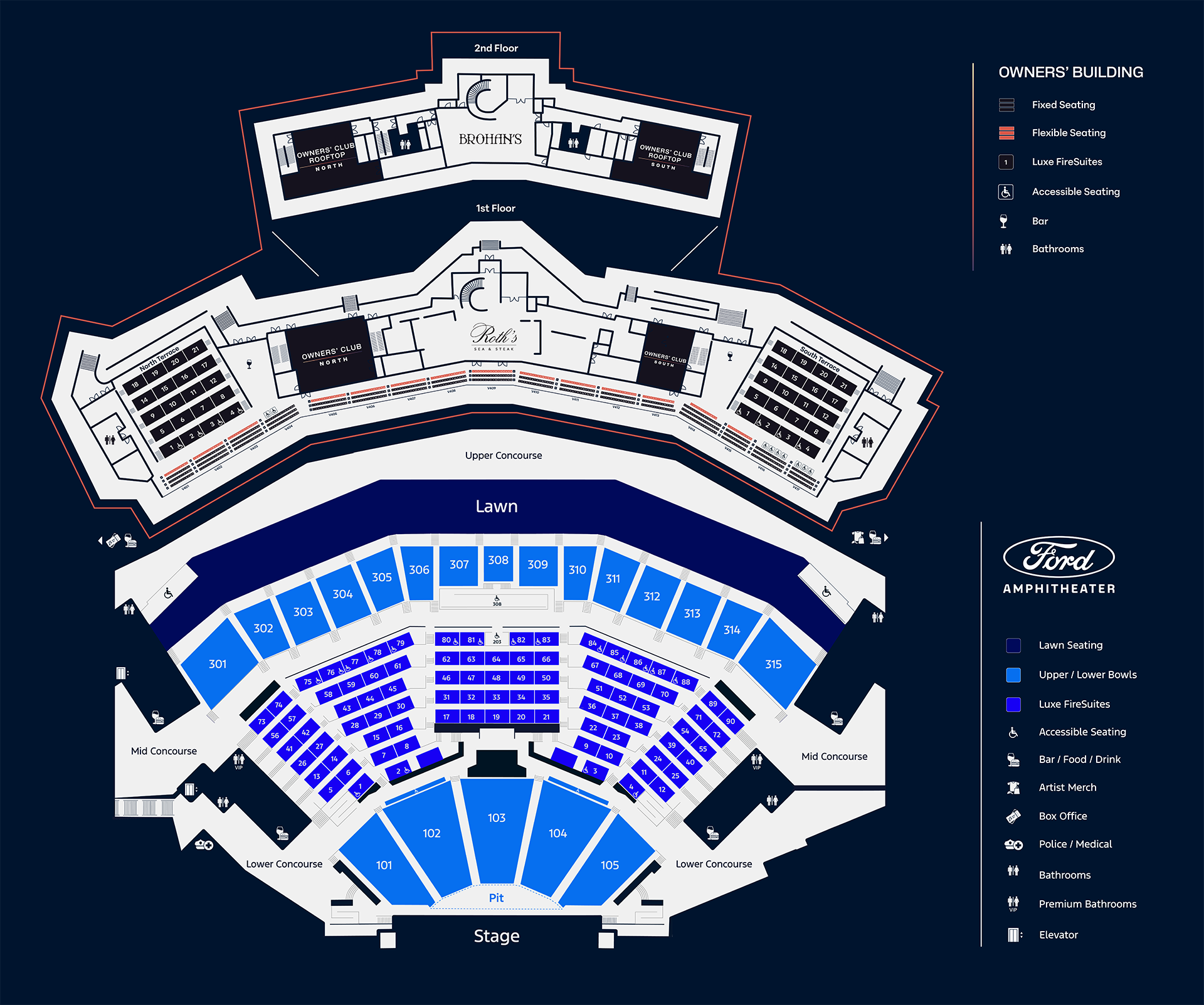 Accessible seating is available in many places throughout Ford Amphitheater, including the front and back sections for the Luxe FireSuites, as well as sections 102, 104, 203, 308 and the lawn. Ticket limits set by the promoter/performer for each show will be applied to accessible seating areas as well. Please check the seating chart for details.